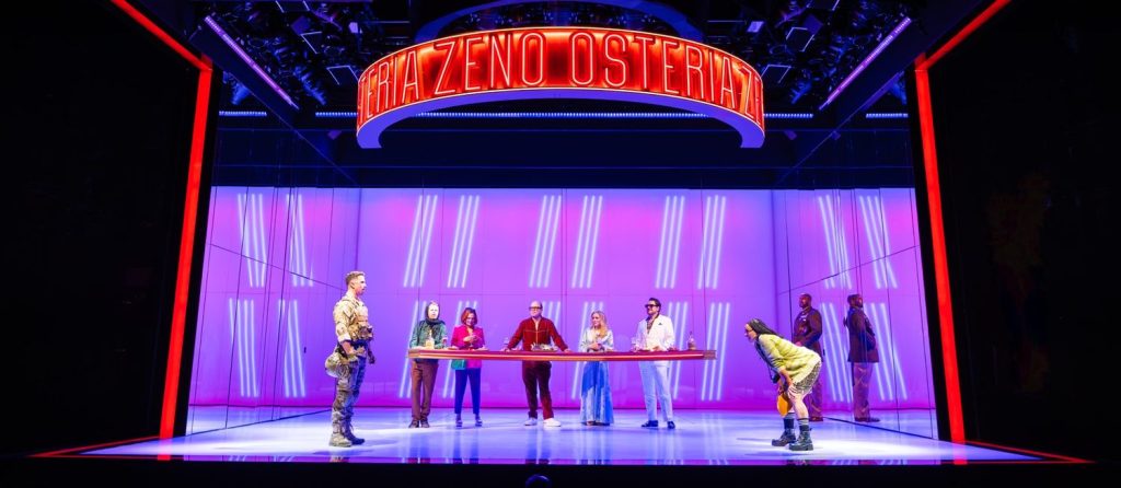 Act I plays like a brilliant comic sketch or a high-end episode of The White Lotus. At one restaurant, the kitchen has nothing to serve. At another, there’s a funeral in the dining room. At yet another, soldiers are rehearsing a war. Each absurdity is punctuated by dry musical numbers, including a witty patter song by Denis O’Hare’s weary waiter and a torchy lament sung by Tracie Bennett as a failed cabaret singer. Sondheim’s lyrics remain razor sharp, laced with modern references (Teslas, sushi, performance art) all with his usual complex internal rhyme and melodic surprise.