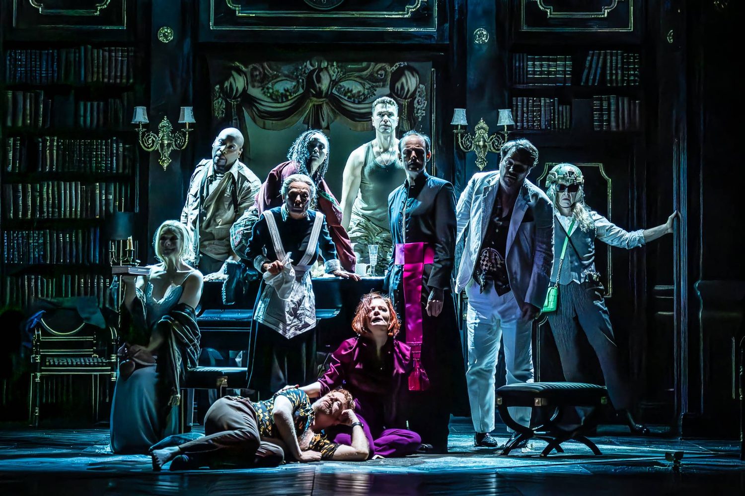 That unease boils over in Act II. The characters gather in the ambassador’s home, sit down to dinner, and then simply cannot leave. The tone shifts. There’s barely any music. The party becomes a prison. The show becomes a play. Characters panic, turn on one another, confess secrets, break down. The artificial world of Act I gives way to a cluttered, ornate salon full of creepy details (including, at one point, a bear). It’s here that the seams of the unfinished musical start to show. Sondheim died before completing the second half, and the absence of music feels abrupt. One character even says, “Rest in peace,” as if to mark the score’s end.