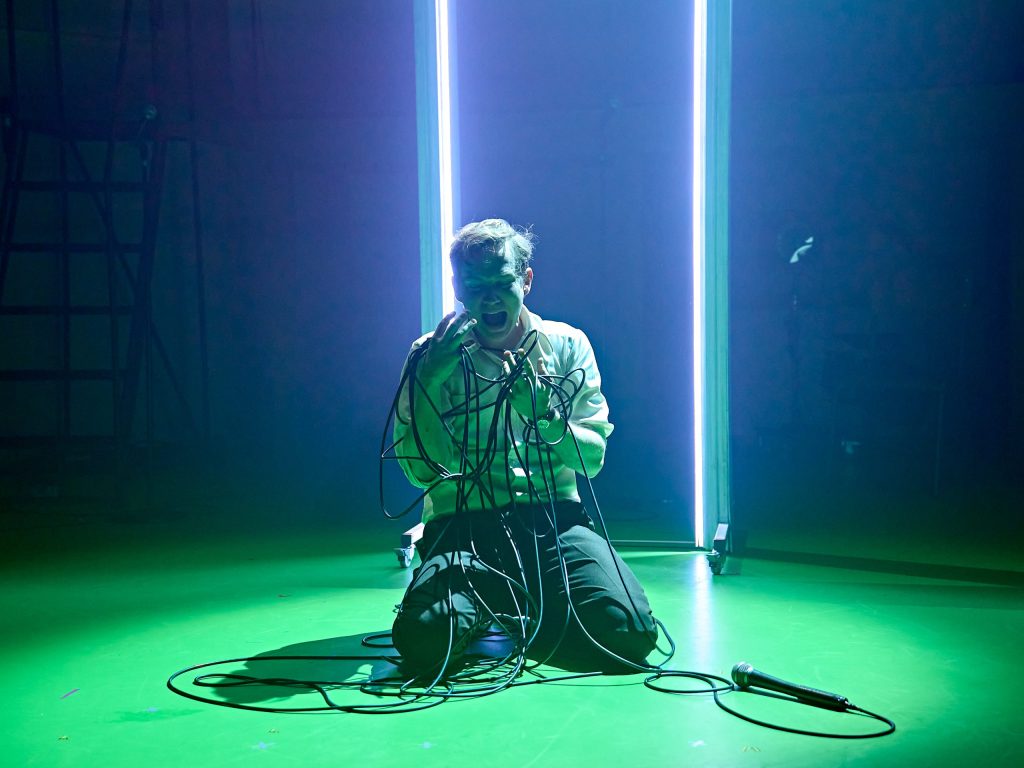Staging choices enhance this effect without overwhelming the text. The set is minimal: a scattering of microphones and a reel-to-reel recorder against a backdrop that never fully defines the place. Pharo’s lighting sculpts breath and shadow, turning Holden’s silhouette into a looming presence, particularly in scenes around a bare chair late in the second act. These choices keep focus on the narrative’s emotional charge rather than distraction by illusion.