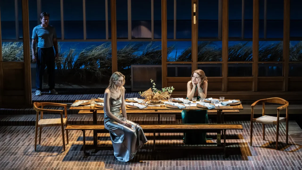 The performances power the evening. Kate Fleetwood gives a scorching turn, every flick of her gaze suggesting pain held so long it has hardened into armour. She glides around the stage in flowing silks, smile razor-thin, and when the mask drops you feel the temperature plummet. Her long monologue midway through act two, part confession and part indictment, earns breath-held silence followed by a collective exhale. Elizabeth Debicki, statuesque in cool metallic gowns and looking nothing like Princess Diana, plays Hilde/Mathilde as a woman who has learned to weaponise calm. She listens more than she speaks, yet one lift of an eyebrow can halt the party dead. She is neither victim nor femme fatale but something knottier, a survivor measuring the cost of speaking out.