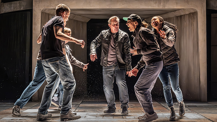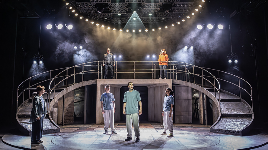 Anna Fleischle’s design is brutalist restraint: concrete slabs, gangways, low walls. At first glance, bare. In practice, merciless. In the club scene, strobe lights and pulsing bass swallow Jacob whole, shrinking him to a corner of the stage. Later, a single cold beam isolates him on a chair, guilt incarnate. Robbie Butler’s lighting and Alexandra Faye Braithwaite’s sound refuse to stay in the background. Beats, hums and sudden noise stabs jar the senses; at times too abruptly, but the jaggedness mirrors Jacob’s own disjointed path.