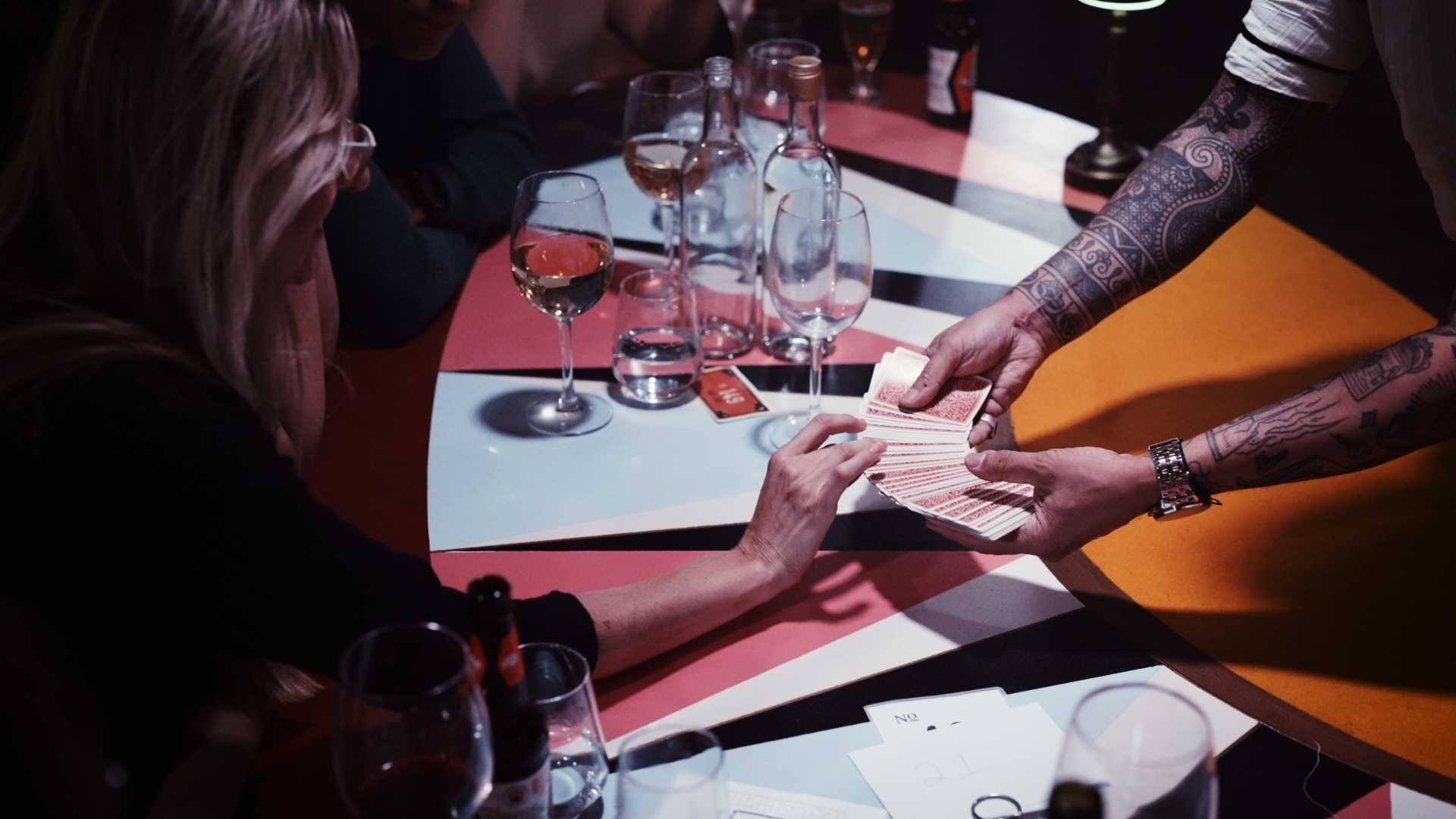 The Magician’s Table is billed as a wake for fictional magician Dieter Roterburg. Candlelight flickers across velvet drapes, a lone accordion sighs in the corner and ‘mourners’ clutch cocktails while swapping stories about a man who never existed. The production is not a play in the traditional sense but an immersive close-up magic event. There is no fourth wall to break because it was never built: performers chat, swap jokes and launch sleights of hand right in front of you, making every guest an active participant in what amounts to a 90 minute carnival of astonishment.